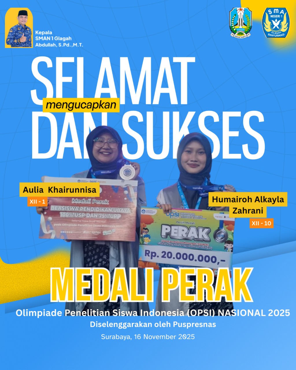SMAN1GLAGAH.SCH.ID — Prestasi membanggakan kembali ditorehkan oleh siswa-siswi SMAN 1 Glagah. Dua siswi berbakat, Humairoh Alkayla Zahrani (kelas XII-10) dan Aulia Khairunnisa (kelas XII-1), sukses meraih medali perak pada Olimpiade Penelitian Siswa Indonesia (OPSI) Nasional 2025 yang diselenggarakan oleh Pusat Prestasi Nasional (Puspresnas) Kementerian Pendidikan Dasar dan Menengah.