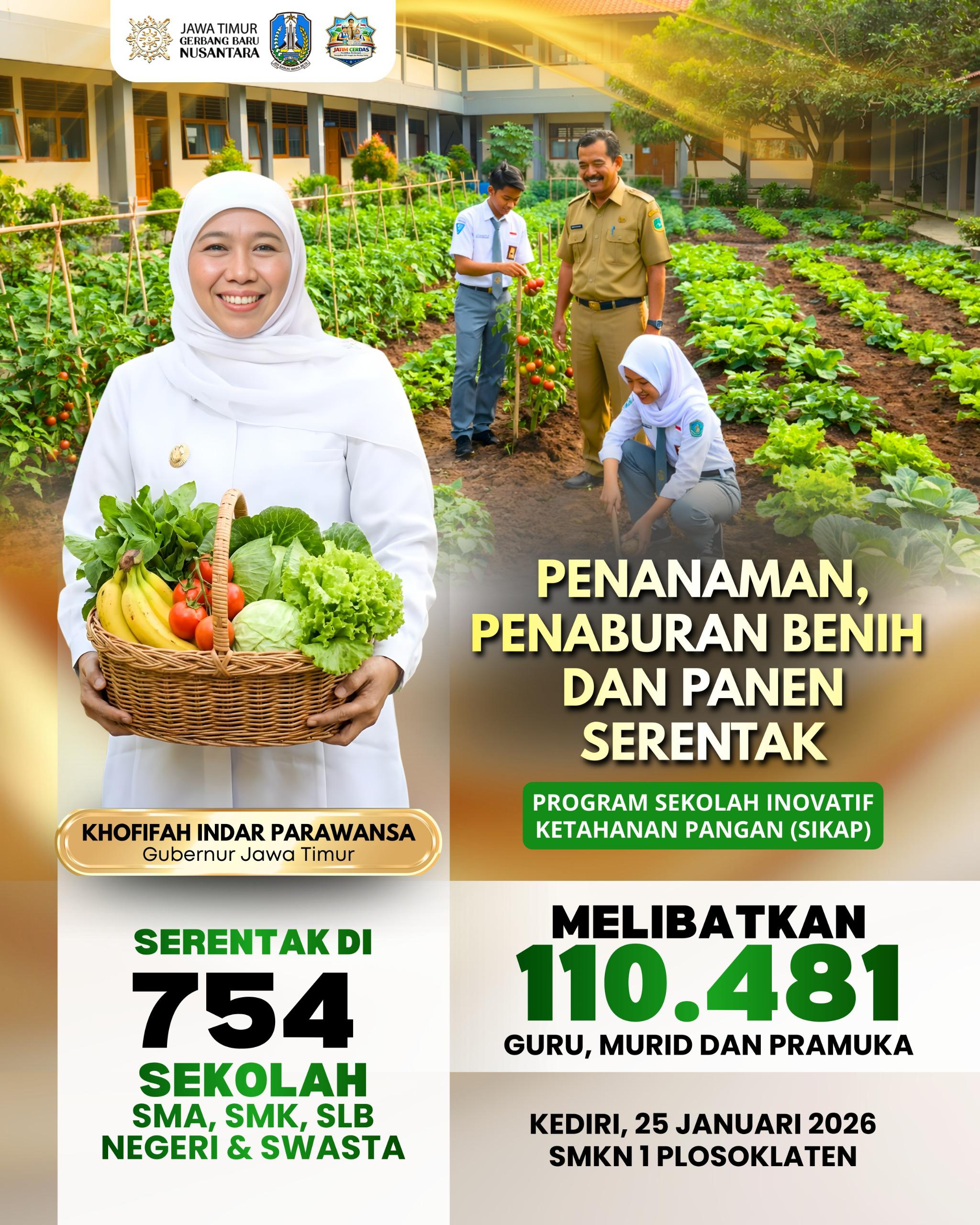 SMAN1GLAGAH.SCH.ID – Pemerintah Provinsi Jawa Timur resmi meluncurkan Program Sekolah Inovatif Ketahanan Pangan (SIKAP) pada Minggu (25/1/2026) di Kabupaten Kediri. Program yang digagas oleh Dinas Pendidikan Provinsi Jawa Timur ini menjadi langkah konkret dalam menanamkan ketahanan pangan berkelanjutan sejak lingkungan sekolah.