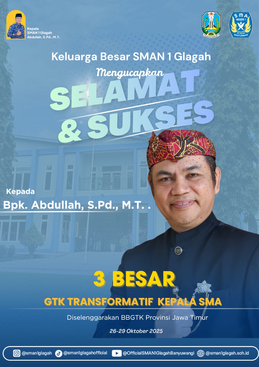 SMAN1GLAGAH.SCH.ID — Kabar membanggakan kembali datang dari SMAN 1 Glagah. Kepala sekolah, Bapak Abdullah, S.Pd., M.T., berhasil masuk tiga besar nominasi Penghargaan Guru dan Tenaga Kependidikan (GTK) Tingkat Provinsi Jawa Timur Tahun 2025 pada kategori GTK Transformatif – Kepala SMA.