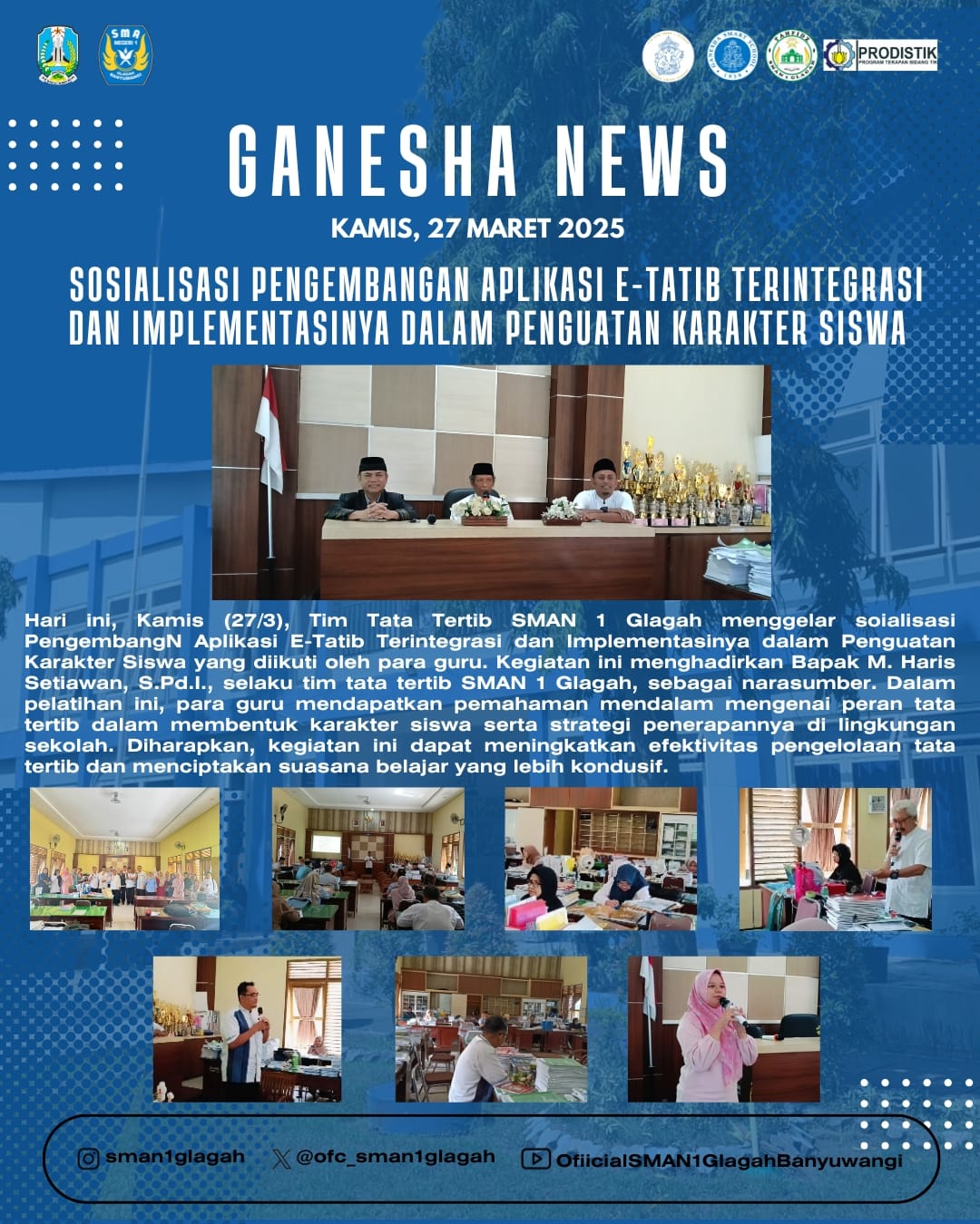 Banyuwangi, SMAN 1 Glagah – Dalam upaya menciptakan lingkungan belajar yang kondusif dan membentuk karakter siswa secara menyeluruh, Tim Tata Tertib SMAN 1 Glagah menggelar sosialisasi mengenai Pengembangan Aplikasi E-Tatib Terintegrasi dan Implementasinya dalam Penguatan Karakter Siswa, Kamis (27/3).